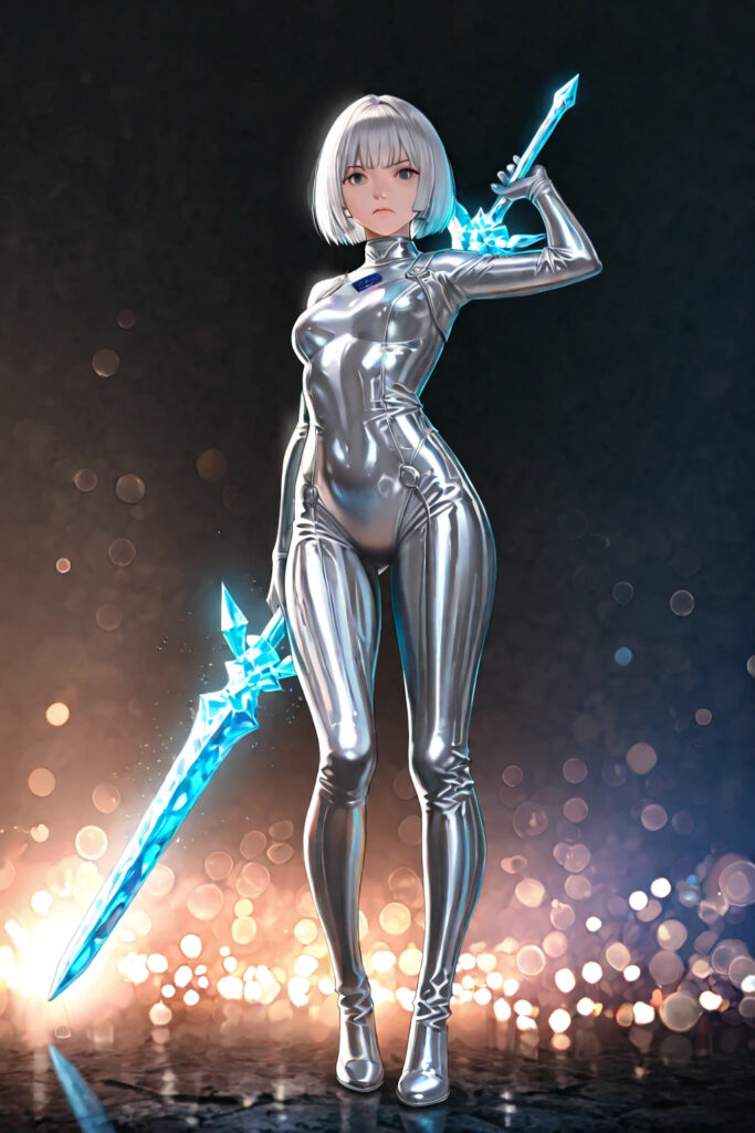 体形がはっきりとわかるほどにピッチリとした、表面が鏡のように光る銀色の全身スーツだった。