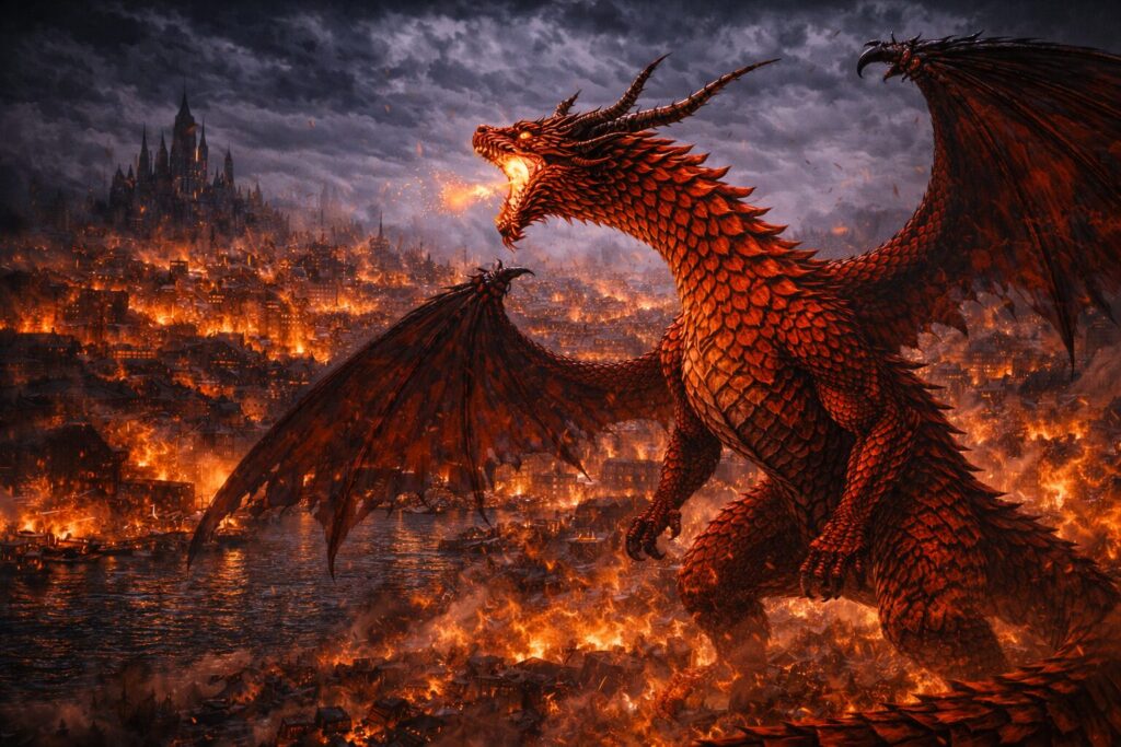 ドラゴンの咆哮が轟くと、赤い熱線が迸り、街の一角を破壊する。