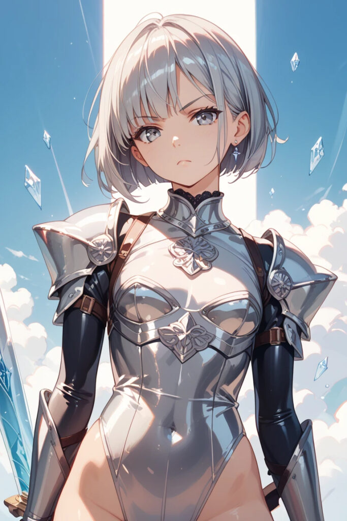 銀姫に転身したナナの姿はシンプルで、全身を鏡のような光沢のボディラインも露わなスッキリとした全身スーツである。