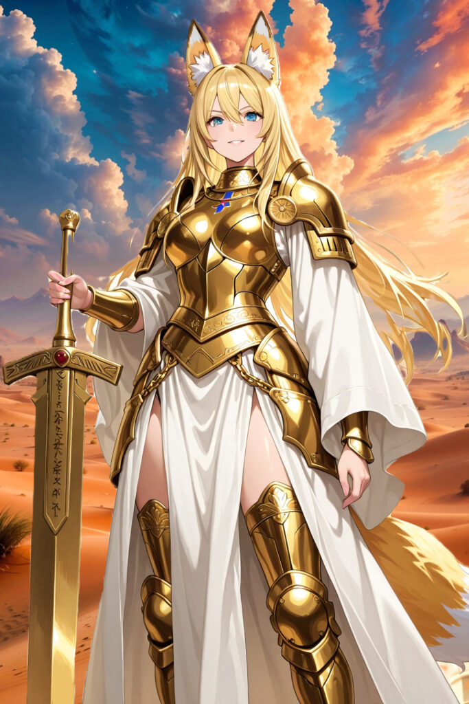 白い羽衣に黄金の鎧、黄金の装飾品、流れる金髪に大きな狐の耳と九つの尾を持つ姿。