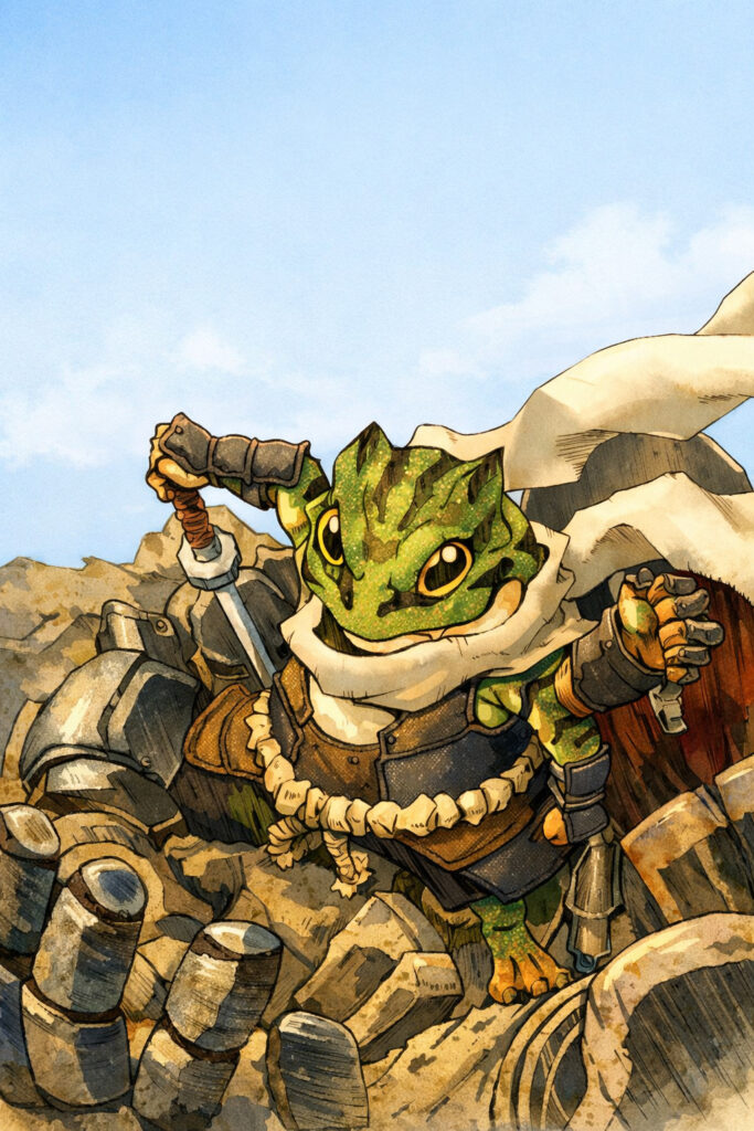 カエル族の跳躍力を利用した、空中から脳天への重い一撃が鎧騎士を真っ二つに破断する。