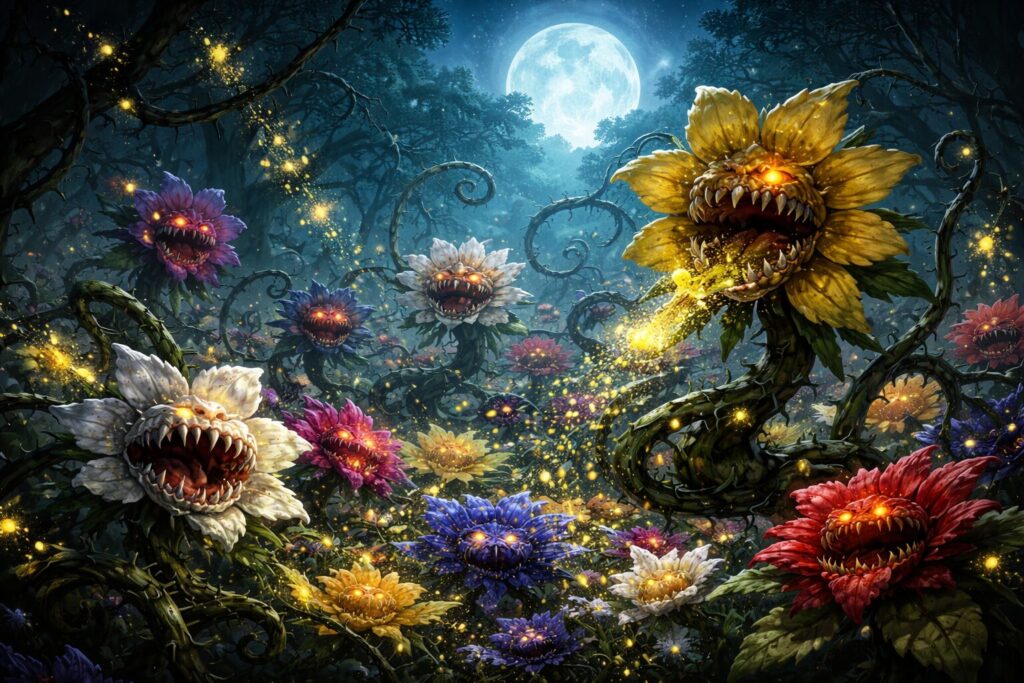 地面に咲き乱れた花々の海から突き出るように、次々と巨大で不気味な花が姿を現したのだ。